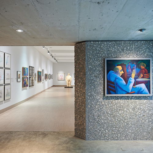 Großflächige Fassadengestaltungen in der Innenstadt von Bleiburg mit Motiven von Manfred Deix und Werner Berg erweitern die Ausstellung in den öffentlichen Raum.