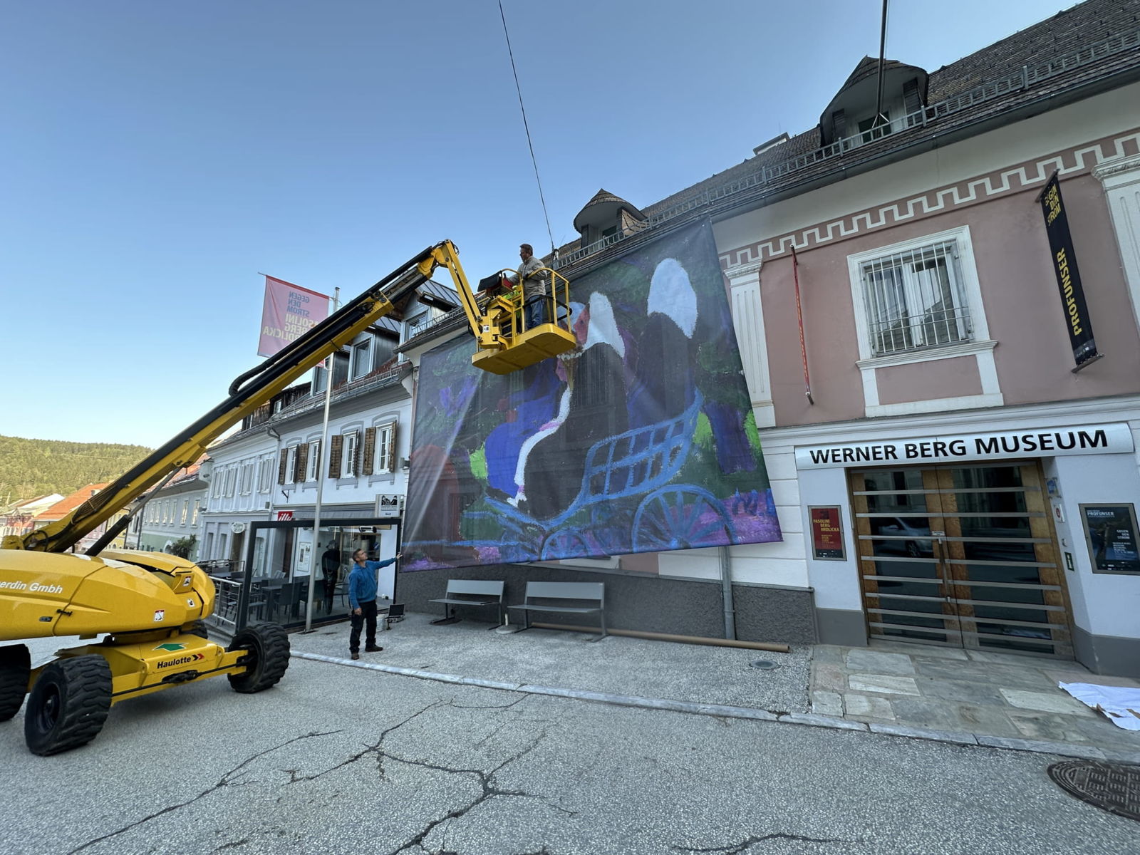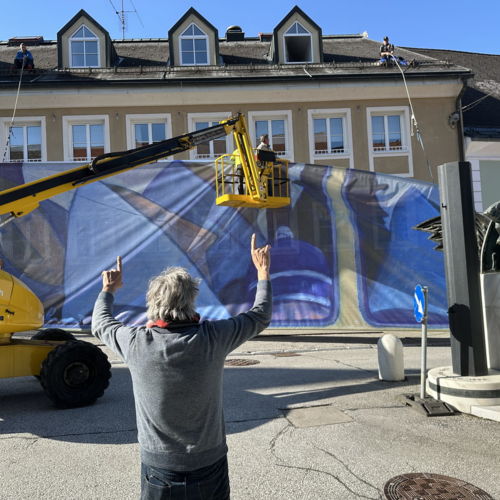 Großflächige Fassadengestaltungen erweitern die Ausstellung in die Innenstadt.