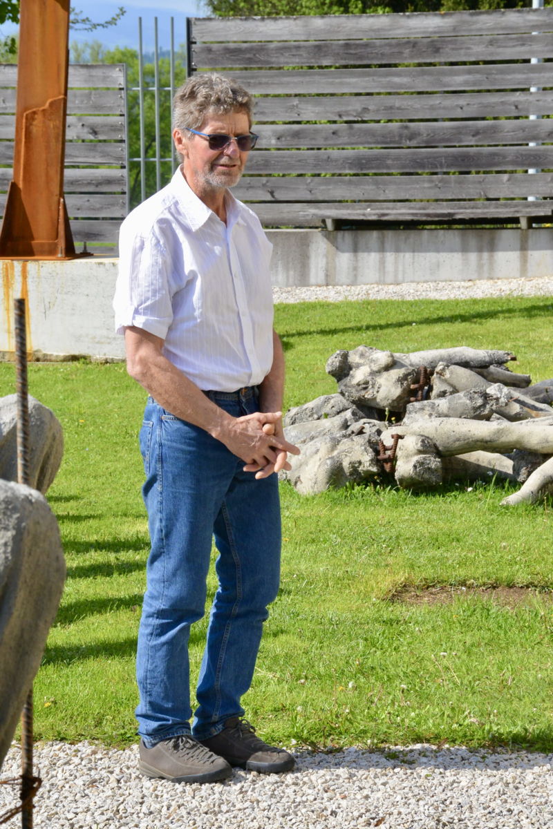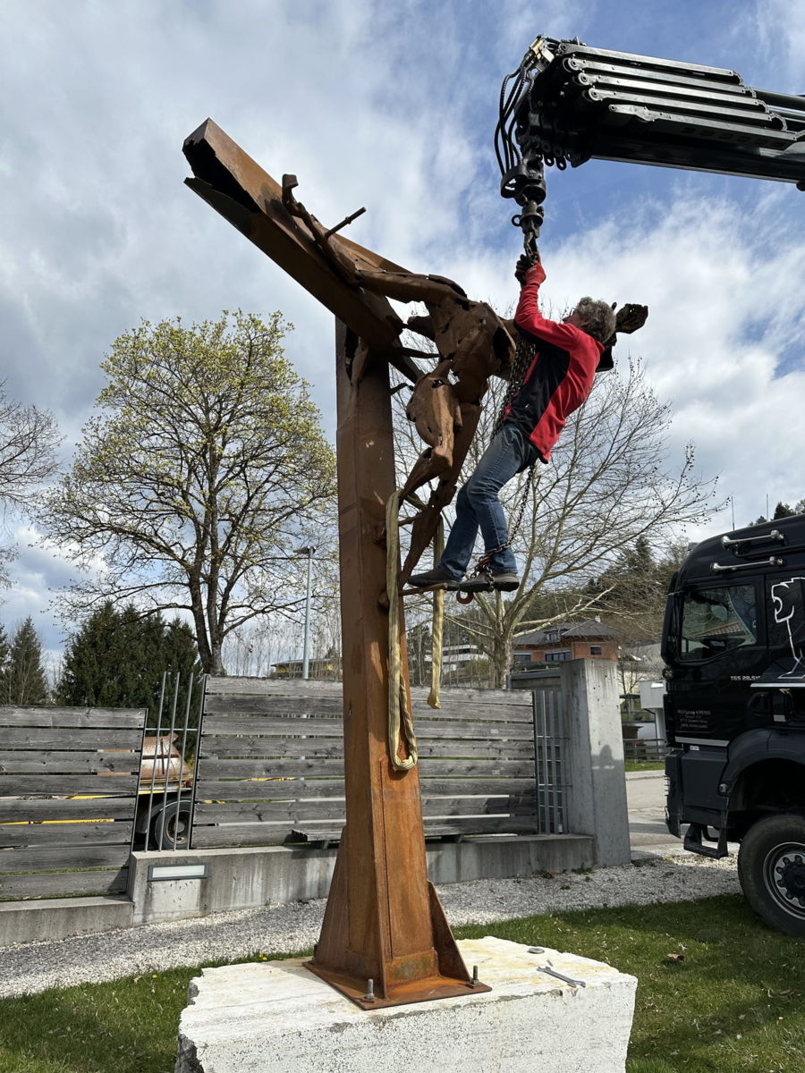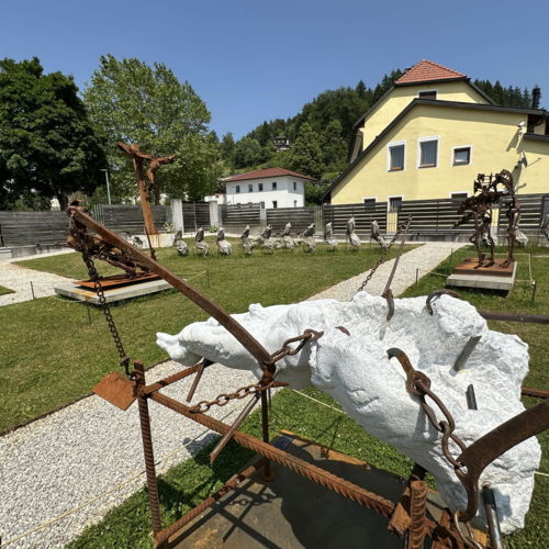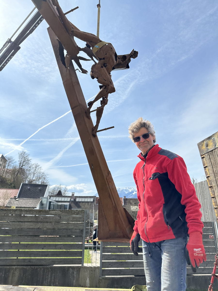 Seine beiden großformatigen Metallskulpturen „Begegnung/ srečanje“ und „Die Getriebenen“ begrüßen bereits seit Jahren die in die Kulturstadt Bleiburg/Pliberk Reisenden an der nördlichen Gemeindegrenze.