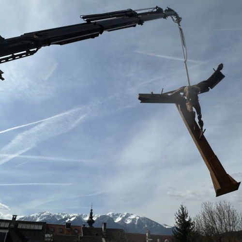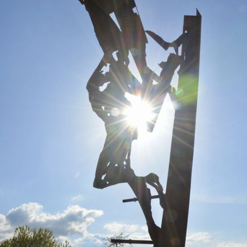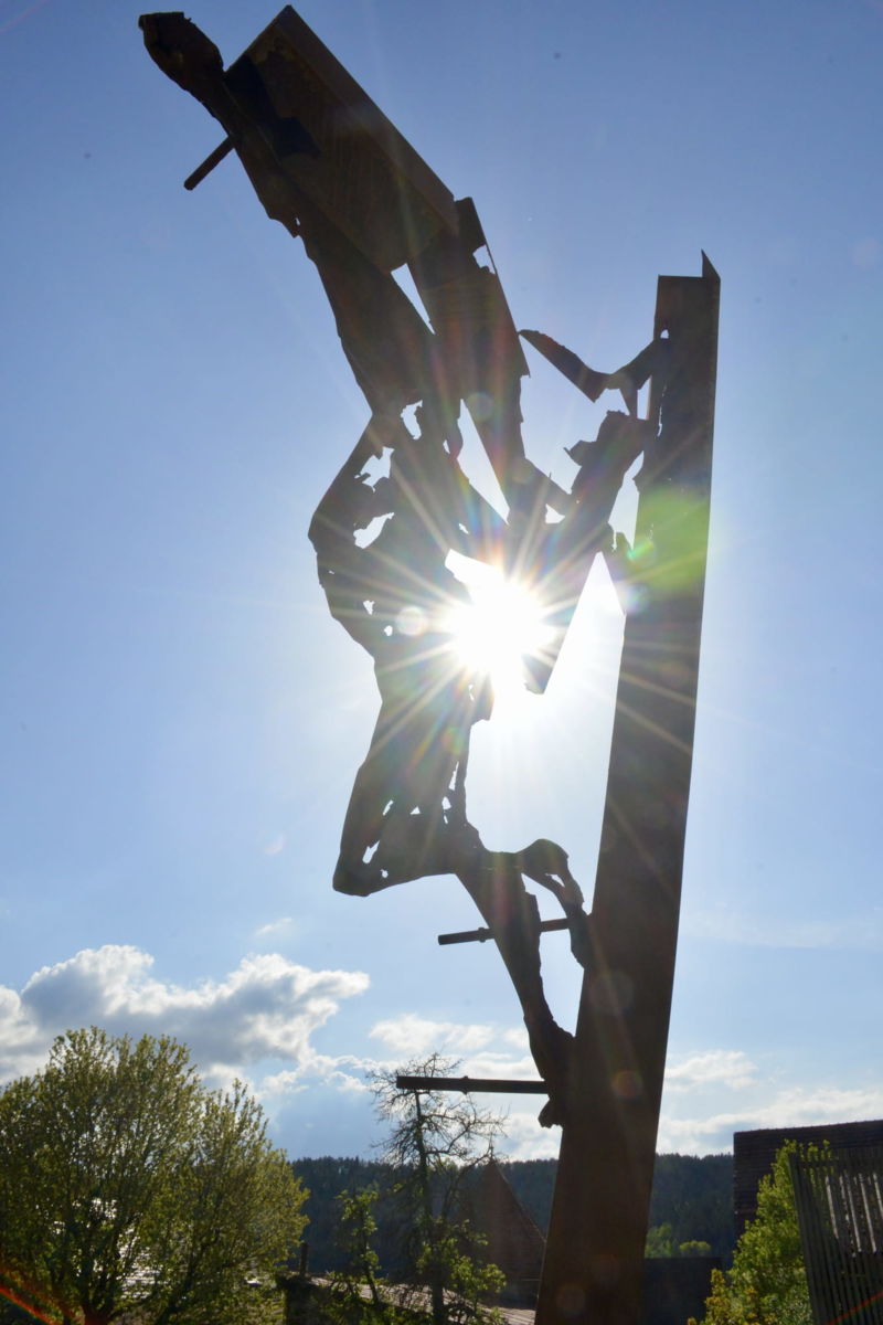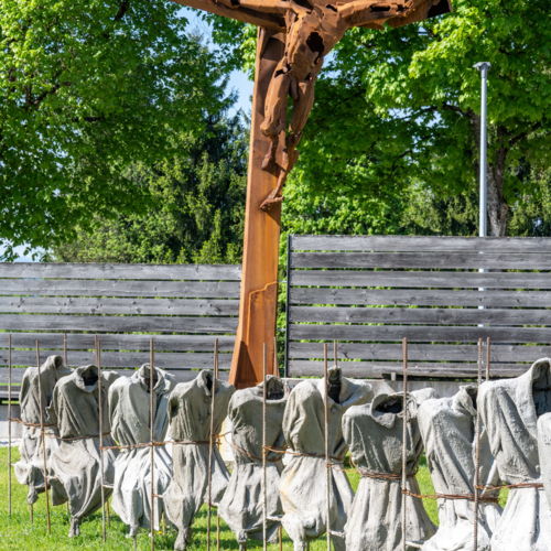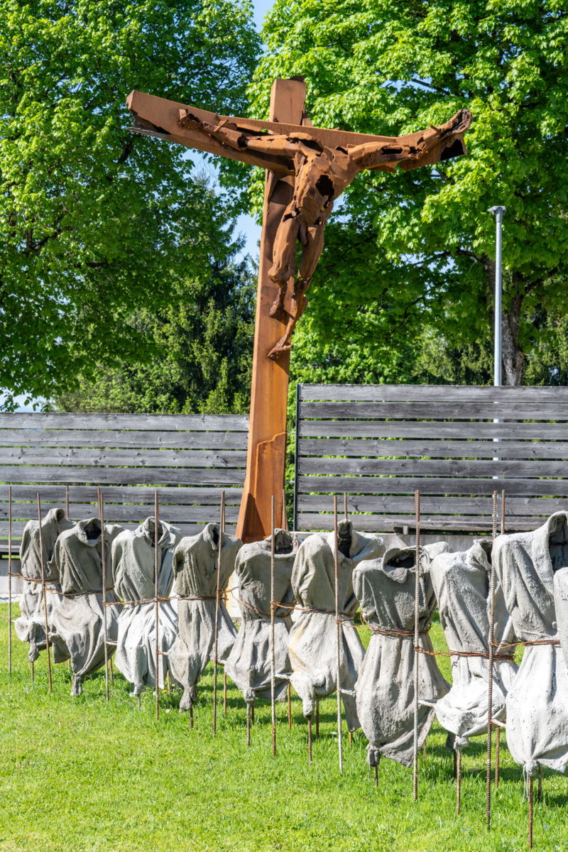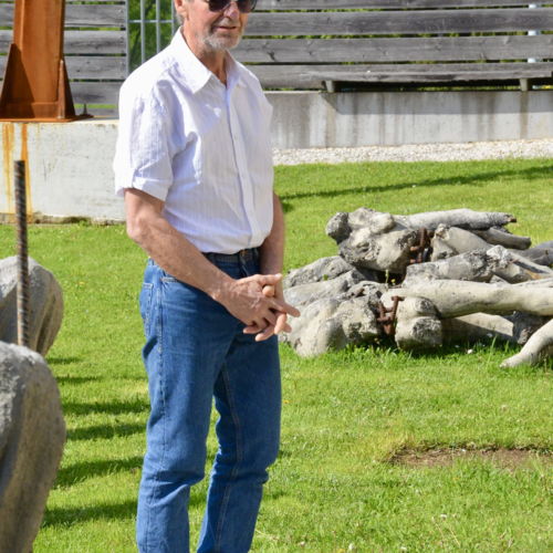 Seine beiden großformatigen Metallskulpturen „Begegnung/ srečanje“ und „Die Getriebenen“ begrüßen bereits seit Jahren die in die Kulturstadt Bleiburg/Pliberk Reisenden an der nördlichen Gemeindegrenze.